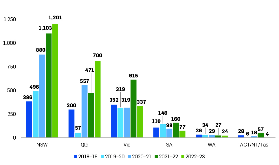 New South Wales set a new record for the third year running, with over $1.3 billion in expenditure in 2022/23, accounting for 56% of the national total. Queensland also set a new record, with total expenditure of $581 million, 23% above last year. Victoria, South Australia and Western Australia all saw declines with spend falling 45%, 52% and 9% respectively. Combined spend in the Australian Capital Territory, Northern Territory and Tasmania declined to $4 million in 2022/23.